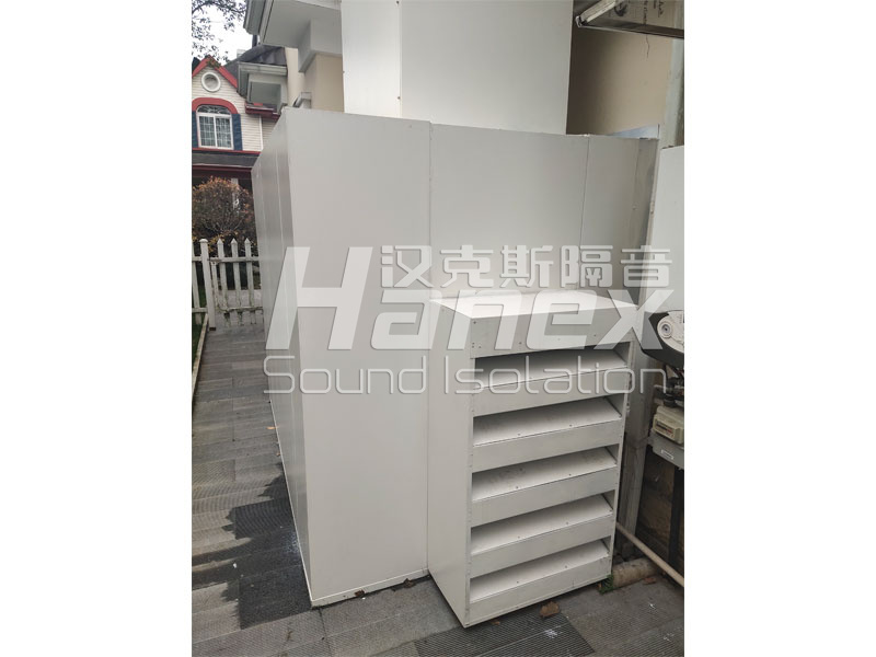 隔聲罩左方安裝設(shè)備檢修門,方便人員進(jìn)出,右側(cè)安裝一臺(tái)通風(fēng)消聲器,保證設(shè)備通風(fēng)散熱的正常。頂部安裝一臺(tái)排風(fēng)消聲器。隔聲罩背面靠墻處安裝吸聲層。